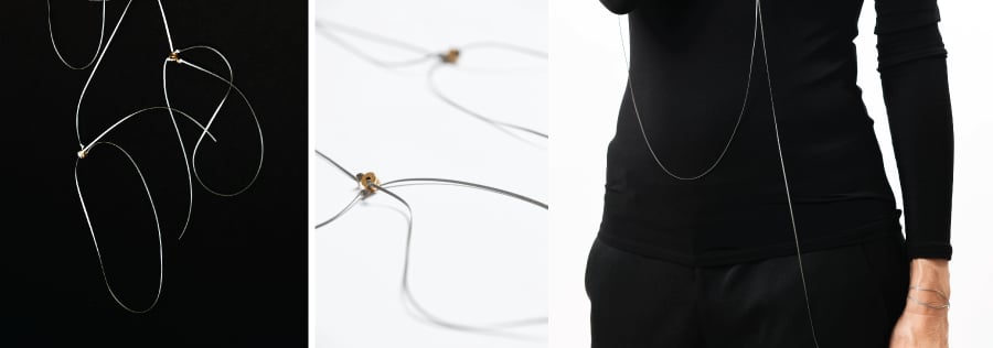 Two bracelets that are connected through a long necklace that is slung around the neck. Made from 1.1 mm reflective material. Fixed around the wrists with gold plated magnets .